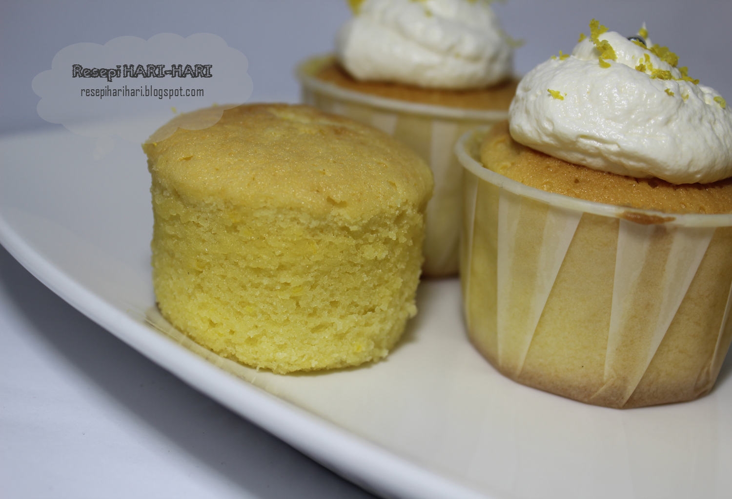 Ini rupa kek baru lepas bakar..dah sejuk sikit baru letak topping..hmm..resepi ni dapat dalam 12 cup..masa prepare sejam sekali ngan hias..resepi ni patut guna lemon base juga untuk Sunquick tu..tapi masa buat ni ada oren punye je..jadi hentam saja la..rasa mix antara oren dan lemon..tak pe la kan..adik beradik je tu..hihi